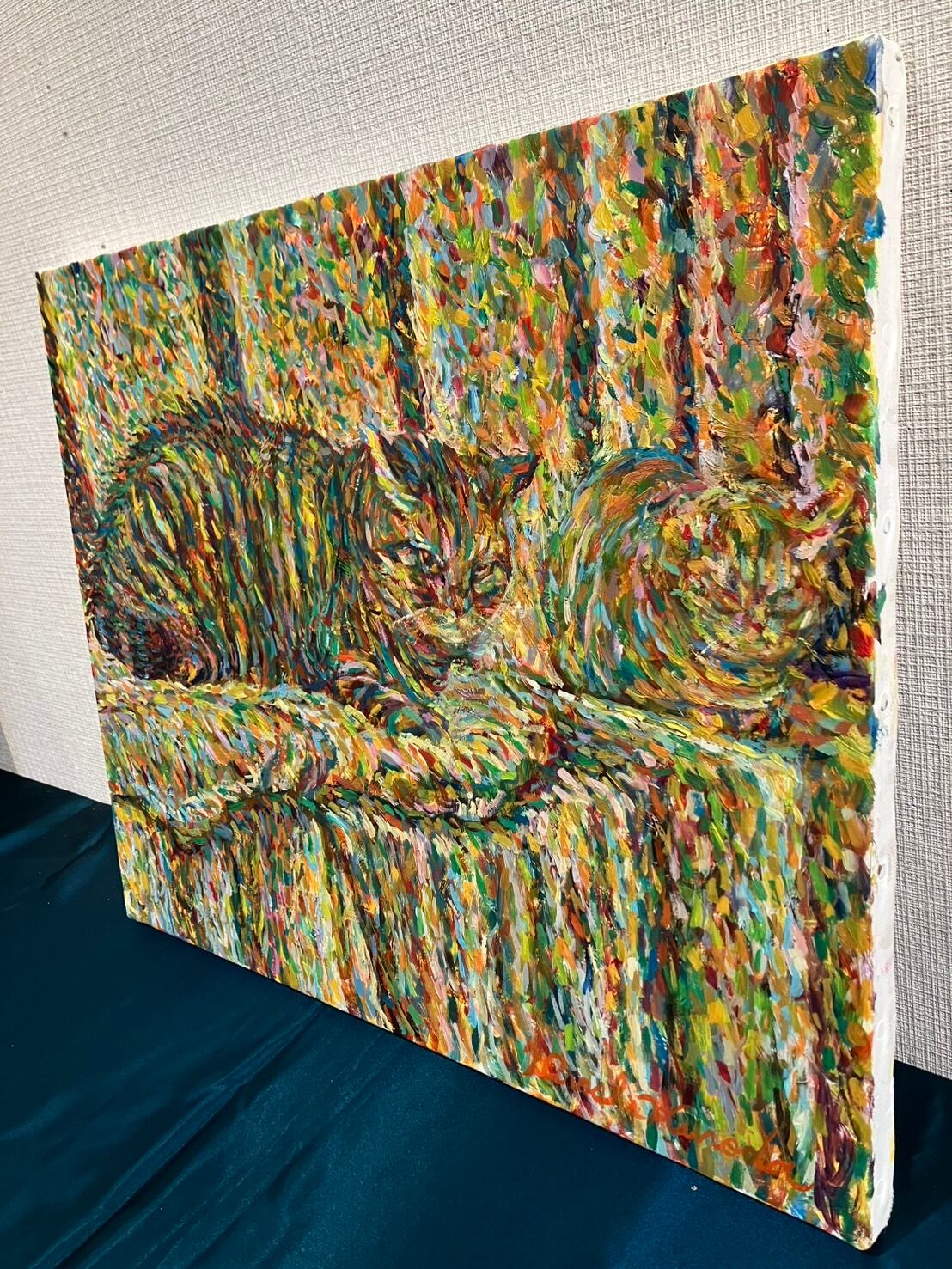 椅子の上でくつろぐ猫たちを、光にきらめく色彩豊かな筆致で描いた油彩画です。