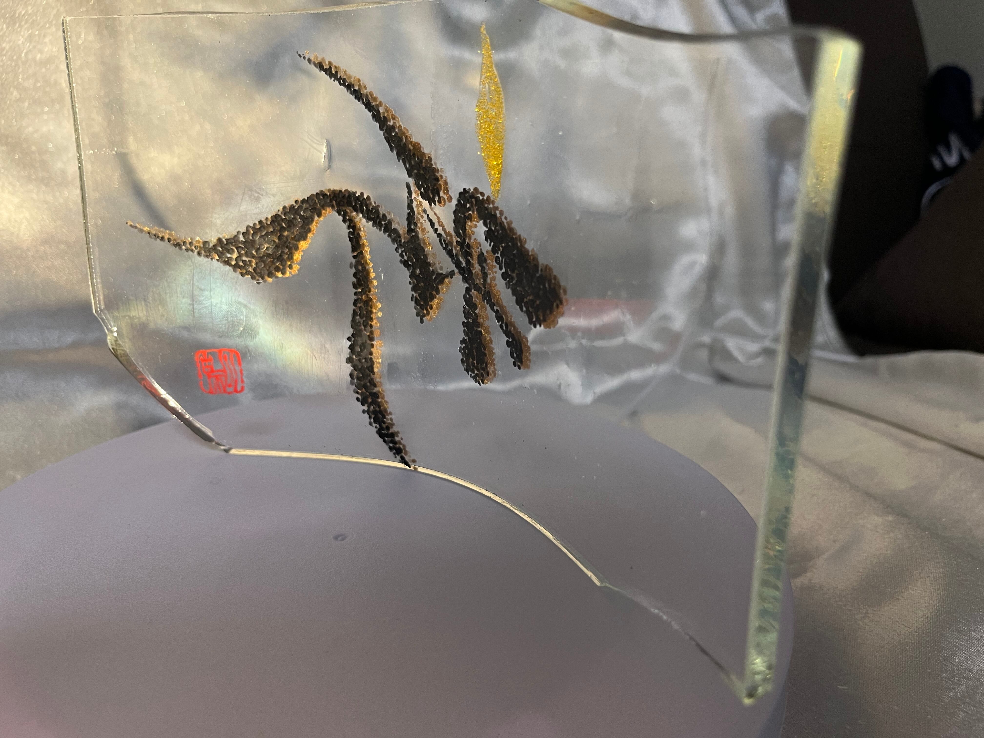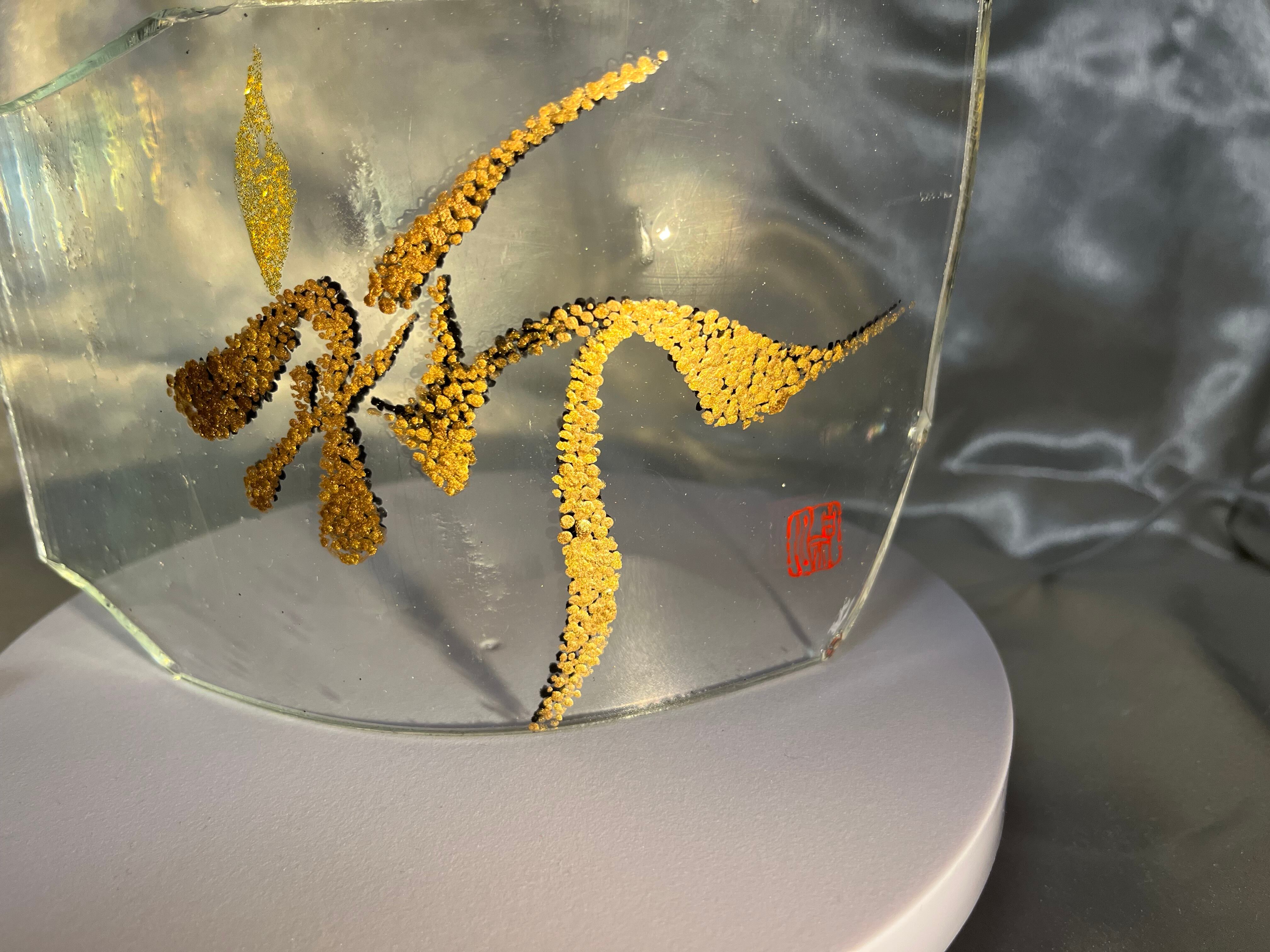 岡本覚氏デザインのリサイクルガラスに施された美しい書道は、ただのインテリアではなく、空間を彩る芸術作品として存在感を放ちます。