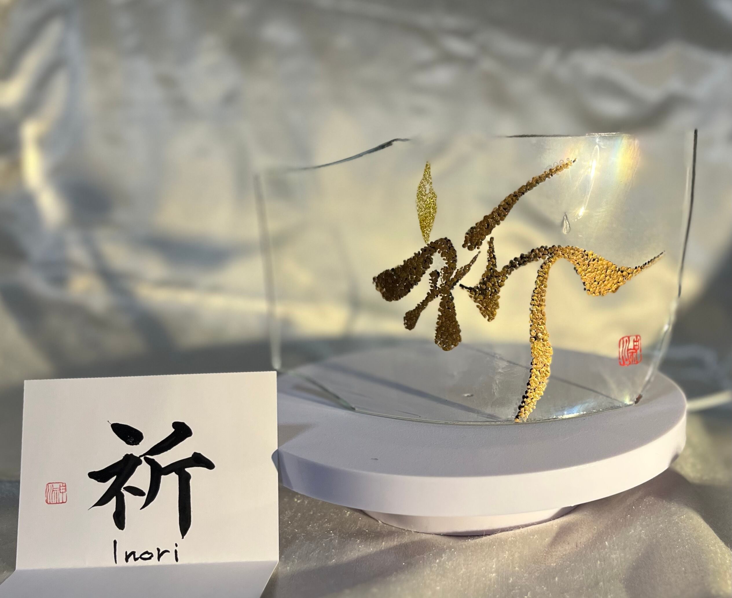 リサイクルガラスに手書きで描かれた「祈」は、心のよりどころ、日々の安らぎを願う気持ちを込めた特別なデザインです。光が差し込むことで変わる文字の色、裏からも点画で文字の厚みを出しています。ガラスの美しい表情が引き立ち、見る人を魅了します。一つ一つが異なるため、同じデザインは存在せず、あなたのもとに届くのはまさにオリジナルの一品です。