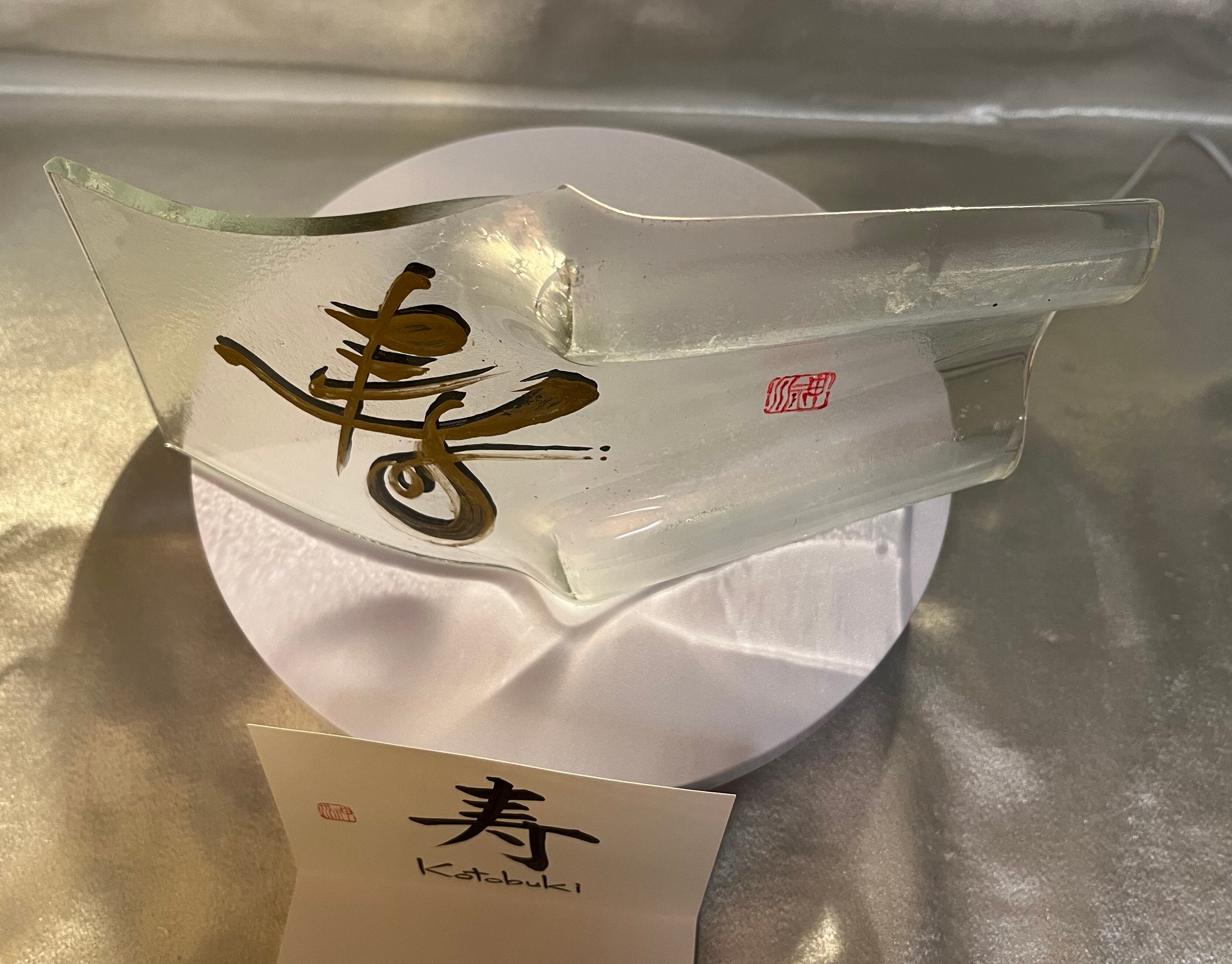 岡本覚氏デザインのリサイクルガラスに施された美しい書道は、ただのインテリアではなく、空間を彩る芸術作品として存在感を放ちます。