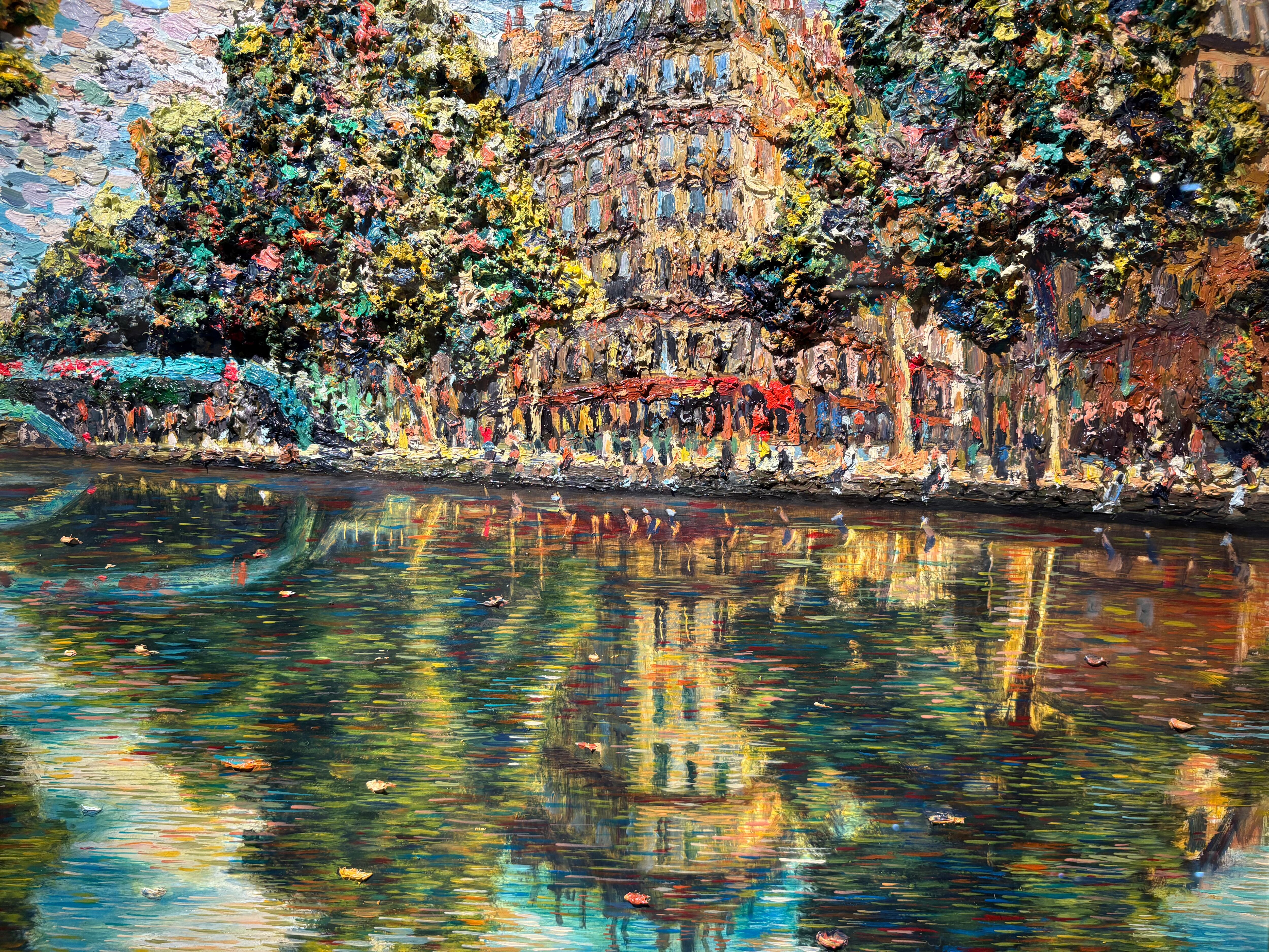 ■この油絵は、発色、耐久性のためキャンバス下処理を16回もし(それだけで2ヶ月かかります)緻密な技法で描かれた風景が特徴です。カナル・サン・マルタンの静謐な水面が反射する光や、周囲の風景が繊細に表現されています。スタンダードな技法の鏡化した水面とオリジナル技法の実景色。個々の作品には唯一無二の魅力がありますので、あなたのもとに届くのは特別な一品です。